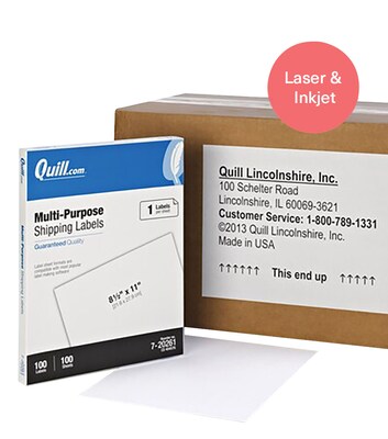 Quill Brand® Laser/Inkjet Shipping Labels, 8-1/2" x 11", White, 100 Labels (Compare to Avery 5165, 5353 & 8165)